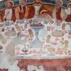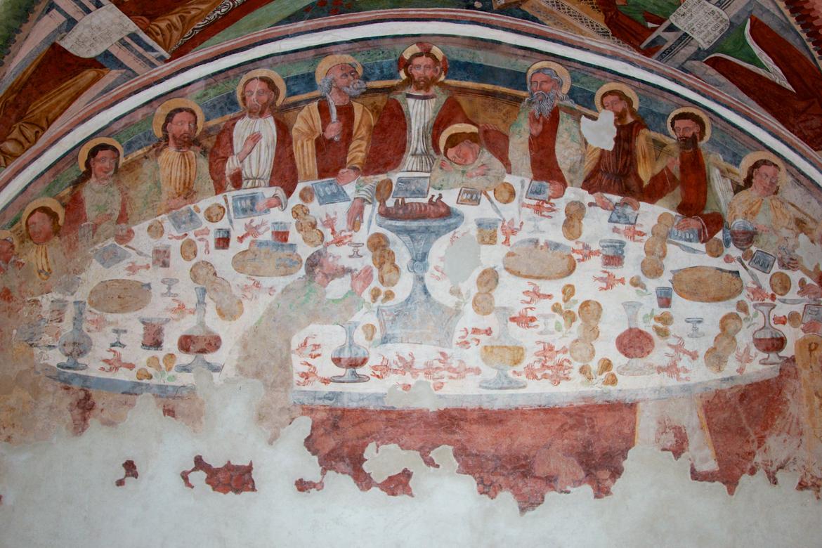 Altrettanto interessante è l’Ultima cena posta sulla parete sinistra, dove spicca il Cristo che sembra intingere un pezzo di pane in una stoviglia per porgerlo a Giuda, come narrato nel Vangelo di Giovanni (13, 24) (Dal Prà 2002, p. 47). Il traditore è posto di fronte a lui, in disparte, con le mani giunte, unico tra quelli seduti a non avere il capo nimbato. Si distinguono facilmente il discepolo prediletto, appoggiato sul tavolo, affranto e consolato da Cristo, e San Pietro, sul lato opposto, che stringe nella mano un coltello. Tuttavia, nella scena, ciò che catalizza maggiormente l’attenzione è la tavola imbandita su cui stanno numerosi gamberi di fiume, che occupano ogni interstizio libero tra le numerose stoviglie degli apostoli.