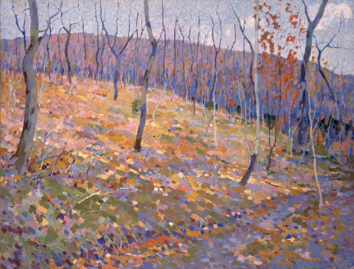 Alessandra Tiddia e Daniela Ferrari, curatrici del Mart, raccontano di aver proposto “un flash, una sorta di ‘testimonianza omeopatica’ degli artisti trentini che tra Ottocento e Novecento hanno riflettuto sul Trentino coltivato. Una scelta attraverso poche opere che indicano però un percorso. Da Luigi Bonazza nei primi anni del Novecento, a Umberto Moggioli, Fortunato Depero, Gino Pancheri. Quattro nomi che testimoniano il passaggio, la cronologia dell’arte trentina, modalità esecutive e stili che dalla pennellata puntinista postdivisionista di Bonazza transitano il tema della terra curata e coltivata dall’uomo attraverso il post impressionismo di Moggioli e Pancheri, o la visione futurista di Depero. Sullo sfondo una splendida vista della valle dell’Adige di Umberto Moggioli (1916), una restituzione molto dettagliata del patrimonio del nostro territorio eseguita per motivi cartografico-militari.