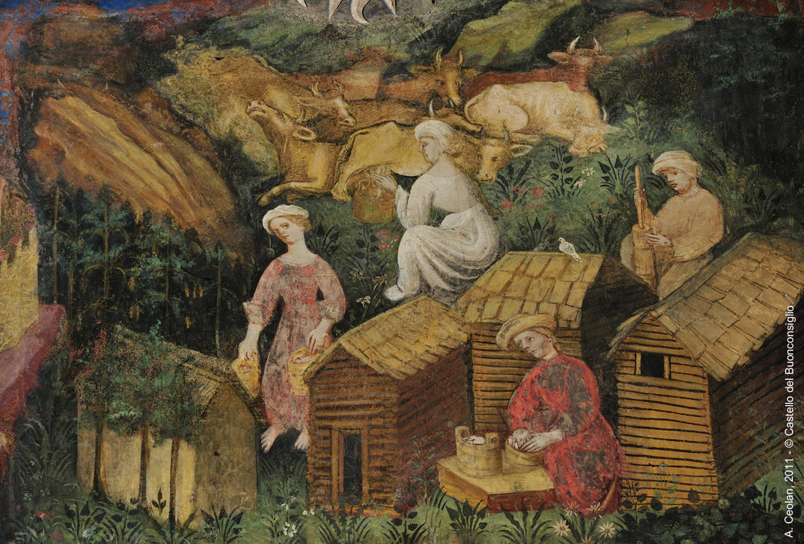 Due libri di conti risalenti agli ultimi anni del XV secolo (quello di Sant’Egidio di Magras in val di Sole e quello di Sant’Andrea di Siror in Primiero) ci parlano in modo particolare della vita di piccole comunità rurali in un’epoca in cui “il modo più efficace di migliorare la redditività di un’impresa era quello di far maggior posto all’allevamento del bestiame” (sono le parole dello storico dell’economia Léopold Genicot). Scopriamo così che gli amministratori della chiesa di Magras avevano affidato a 18 individui complessivamente 22 vacche; se si tiene conto del fatto che Magras aveva (e ha) poche centinaia di abitanti, si capisce che questa concessione riguardava praticamente tutte le famiglie. Non si può parlare, in questo caso, solo di un semplice adeguamento alle forme dell’economia locale ma proprio di una specifica promozione dell’allevamento bovino, operata attraverso la concessione agli abitanti del villaggio di capi di bestiame; in cambio essi dovevano fornire un affitto; a eventuali debiti si faceva fronte con la cessione alla chiesa dei propri terreni, senza però perderne il diritto d’uso. L’ente-chiesa era la persona giuridica, espressione della collettività, che organizzava e garantiva tale meccanismo. Il libro di conti della chiesa di Sant’Andrea di Siror riporta invece numerose voci di entrata e di uscita connesse con l’allevamento di buoi, vacche, vitelli, caure, piegore. Il bestiame veniva comprato, venduto, gestito direttamente o concesso con contratti di soccida; molte annotazioni riguardano anche il commercio di derivati come il formaggio o lo smalzo (il burro).