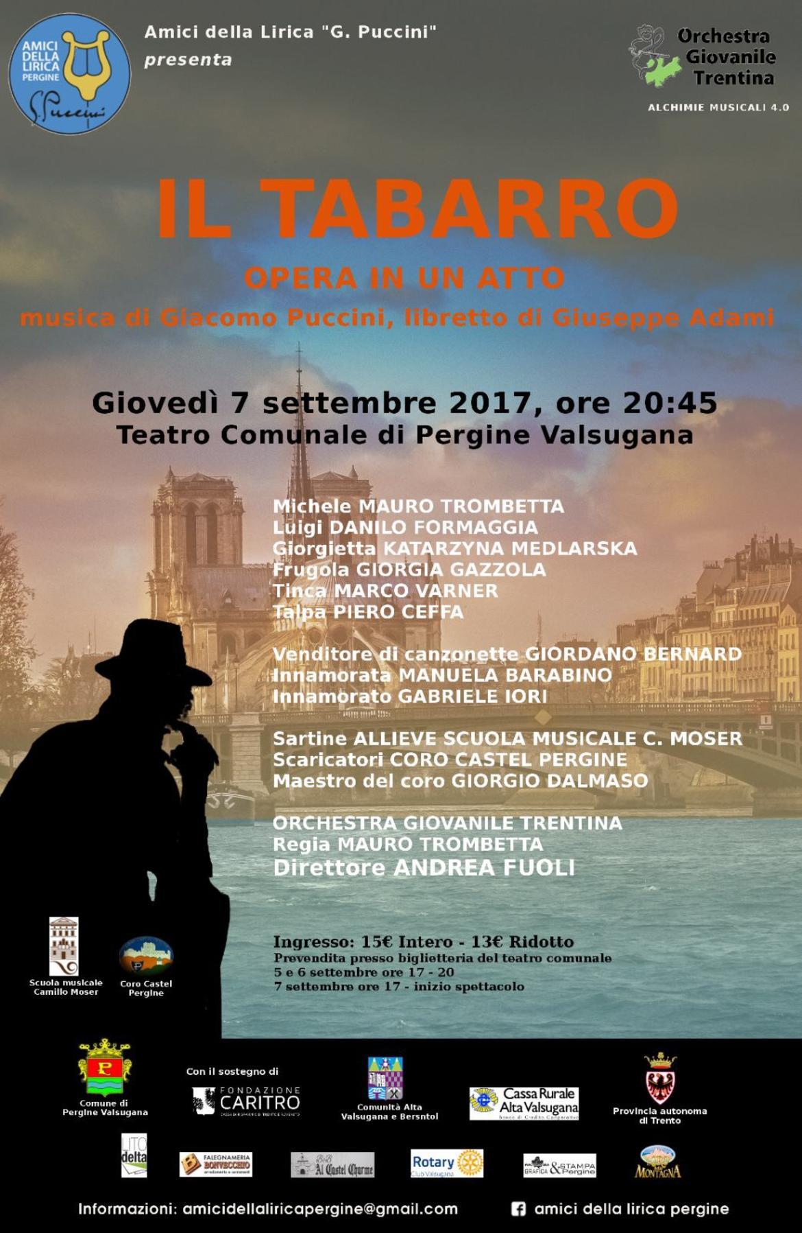 Dopo il successo ottenuto nel 2016 con la produzione di “Suor Angelica”, giovedì 7 settembre alle 20.45 presso il teatro comunale di Pergine Valsugana “Il tabarro” di Giacomo Puccini debutta con il nuovo allestimento scenografico curato dall'Associazione “Amici della Lirica Giacomo Puccini” di Pergine Valsugana, in collaborazione con l’Orchestra Giovanile Trentina, il Coro Castel Pergine e la Scuola Musicale Camillo Moser. L'opera è su libretto di Giuseppe Adami. regista Mauro Trombetta (già direttore artistico dell’Arena di Verona) che sarà anche fra gli interpreti nel ruolo di Michele, mentre la soprano Katarzyna Medlarska darà voce al personaggio di Giorgetta.