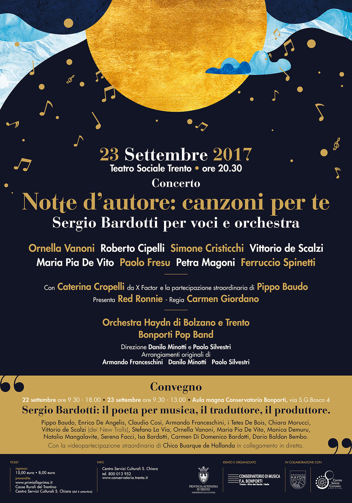 Baudo, Vanoni e Cipelli, Cristicchi, Fresu, De Scalzi dei New Trolls, Magoni e Spinetti, De Vito, Cropelli, Bonporti Pop Band, Orchestra Haydn: sono le stelle che brilleranno nella “Notte d’autore - Canzoni per te” di sabato 23 settembre 2017, dedicata a Sergio Bardotti (autore dei testi di “Canzone per te”, “Piazza grande”, “Quella carezza della sera” e di decine di altri successi della canzone italiana).