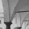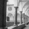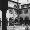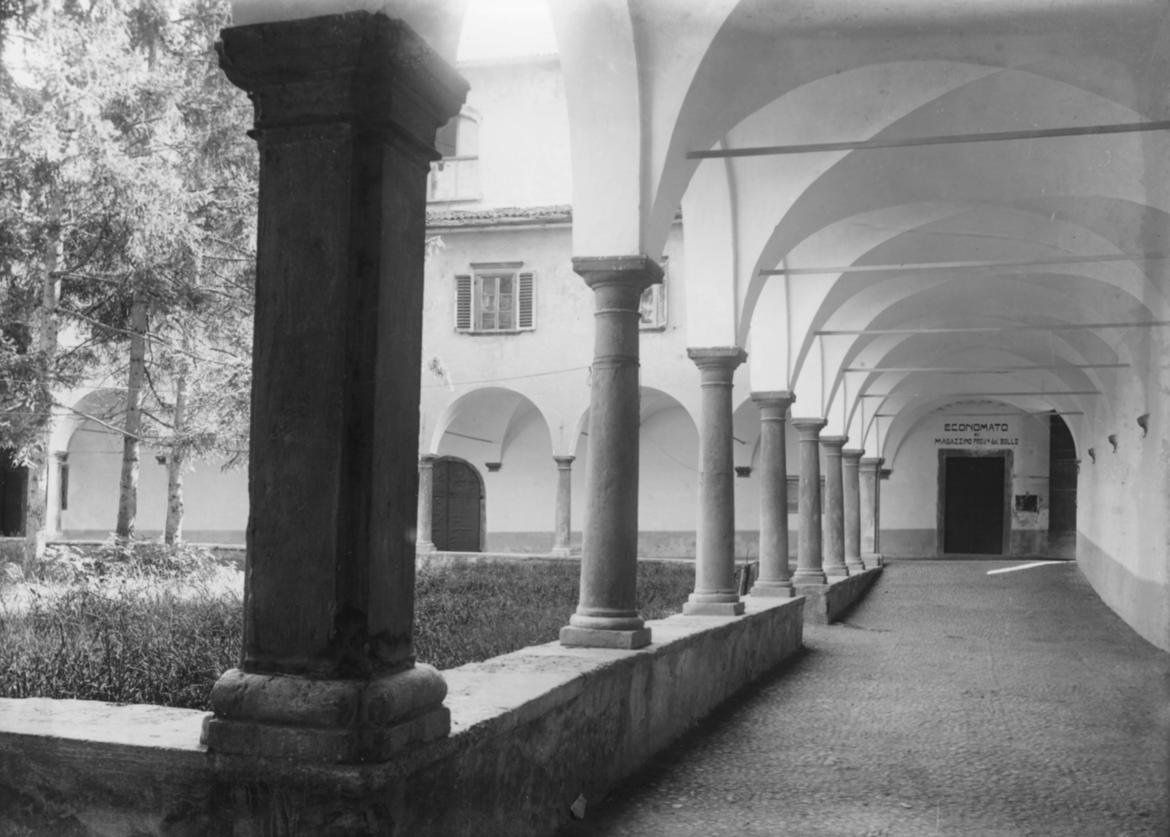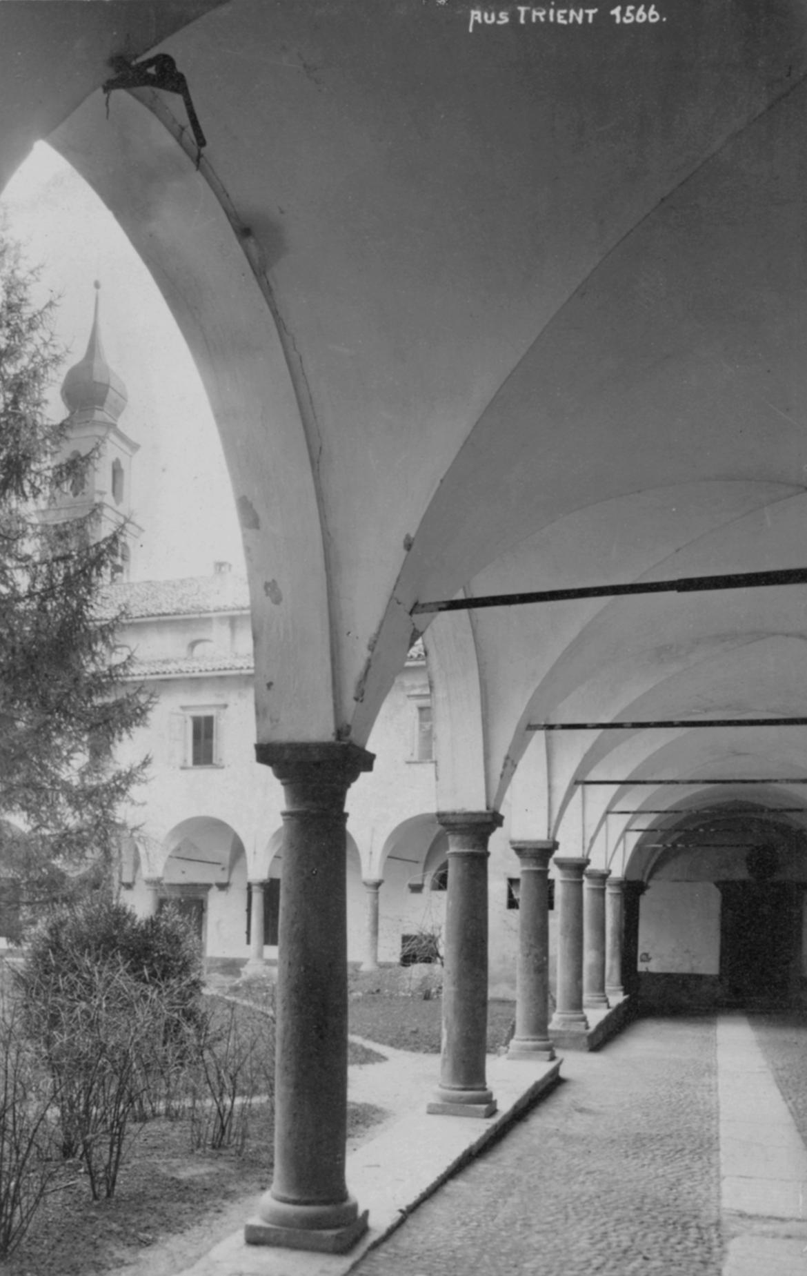 Trento. Anni Venti-Trenta del Novecento. Sergio Perdomi riprende uno scorcio del chiostro dell’ex convento degli Agostiniani (detto anche di San Marco dall’intitolazione dell’adiacente chiesa), soppresso dai Francesi nel 1810. Nello spazio centrale, coltivato a prato, svettano tre betulle, piantate dagli Austriaci nella seconda metà dell’Ottocento, quando le celle dei frati e gli altri ambienti della vita comune del clero erano già stati adibiti ad “uffici dell’amministrazione distrettuale di Finanza” e a magazzini di tabacchi. Le colonne tuscaniche che reggono sette arcate per ogni lato, i pilastri d’angolo, i bancali in pietra, le volte a crociera ribassate e i pavimenti acciottolati degli ambulacri appaiono in buono stato di conservazione.