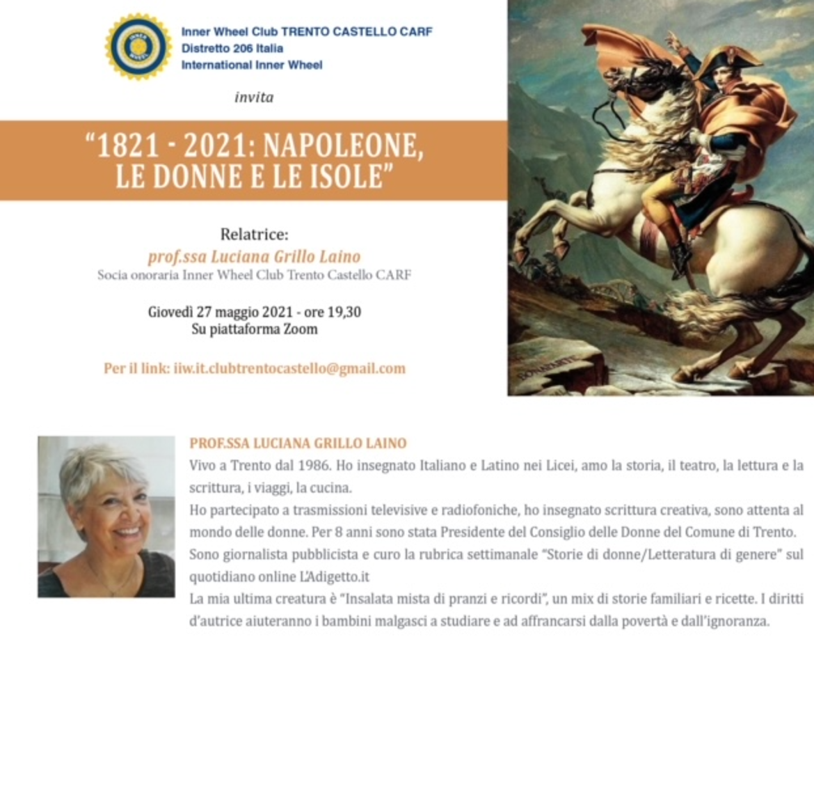 il Club Trento Castello CARF offre un webinar su un argomento storico-culturale.Nel mese dell’anniversario della morte di Napoleone - 5 maggio 1821/5 maggio 2021 sarà interessante sentire parlare di lui, delle donne che ha amato e delle isole che ha “vissuto”.Saremo felici di ascoltare Luciana Grillo, di cui conosciamo la cultura e le capacità e che possiamo presentare, con molto orgoglio, come nostra Socia Onoraria del nostro Club. Chi fosse interessato mi contatti all’email luisafronza@yahoo.it