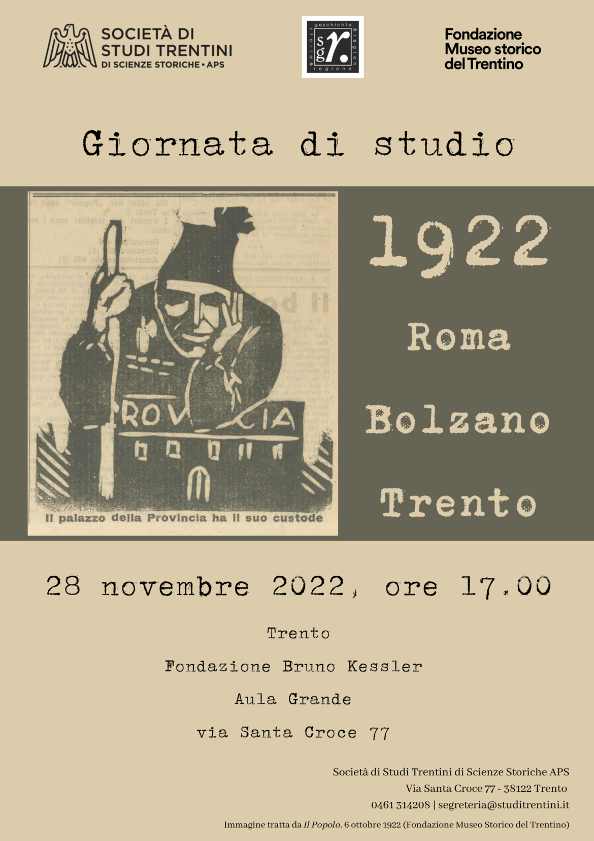 La Società di Studi Trentini di Scienze Storiche promuove un momento di riflessione storiografica in occasione del centenario della marcia su Roma, in cui vengano messi in luce (e confrontati tra di loro) da una parte gli aspetti più generali dei tentativi di colpo di stato che nel 1922 e 1923 furono compiuti dai nascenti movimenti della destra radicale: in Italia il fascismo e in Germania il nazionalsocialismo.