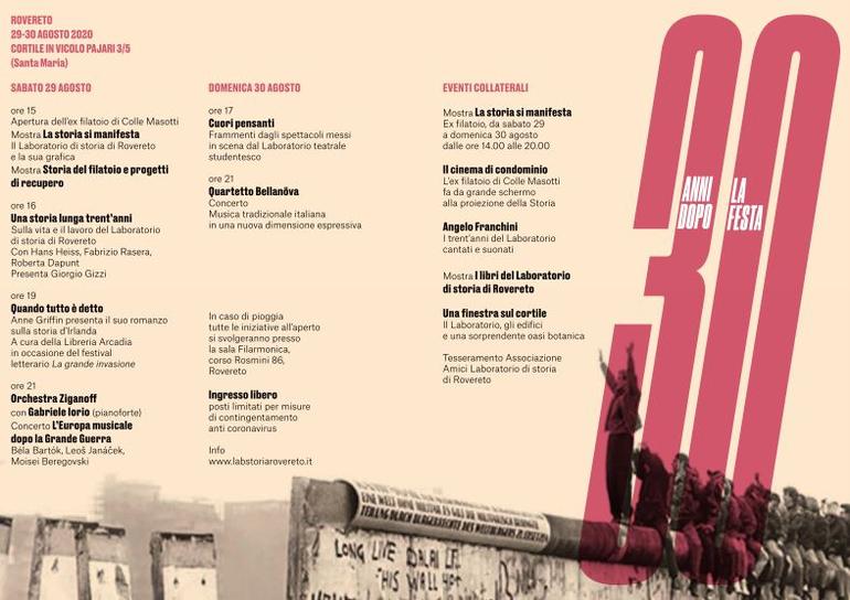 Ex filatoio, da sabato 29 a domenica 30 agosto dalle ore 14.00 alle 20.00 Il cinema di condominio. Ex filatoio di Colle Masotti fa da grande schermo alla proiezione della Storia Angelo Franchini. I trent'anni del Laboratorio cantati e suonati Mostra I libri del Laboratorio di storia di Rovereto Una finestra sul cortile. Il Laboratorio, gli edifici e una sorprendente oasi botanica