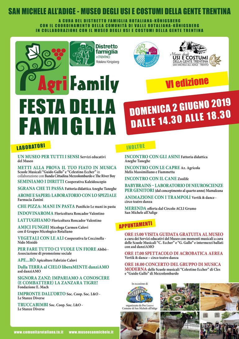 “AgriFamily” ha luogo durante “Adesenfestasanmichel”, la festa della comunità di San Michele all’Adige organizzata dalla Pro Loco e dall’Assessorato alla Cultura del Comune, che celebra il legame dei due abitati di Grumo e San Michele con il fiume che li attraversa proponendo stand enogastronomici, concerti, spettacoli e numerose iniziative.