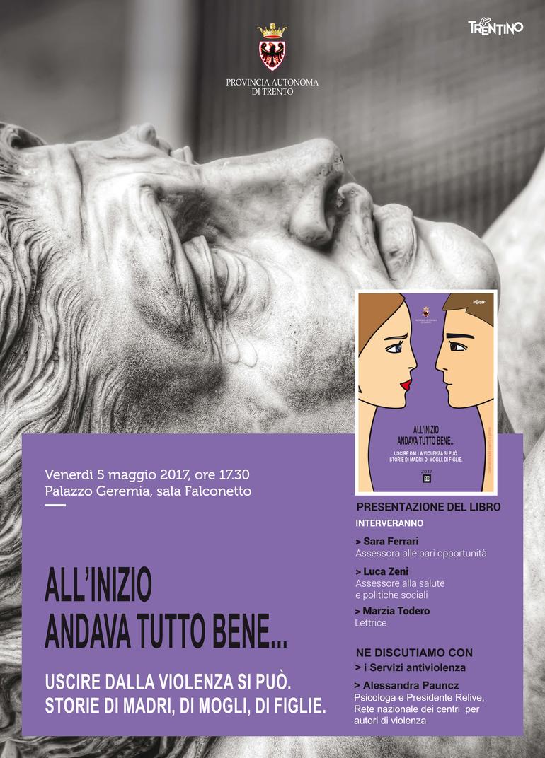 L'appuntamento sarà aperto dagli assessori provinciali alle pari opportunità, Sara Ferrari e alla salute e politiche sociali, Luca Zeni e vedrà la presenza di Alessandra Pauncz, psicologa e presidente di Relive - Rete nazionale dei centri per autori di violenza, e di Marzia Todero che proporrà la lettura e l'interpretazione di alcuni brani del testo; a moderare Lucia Trettel, responsabile dell'Ufficio per le politiche di pari opportunità e conciliazione vita-lavoro dell'Agenzia per la Famiglia.
