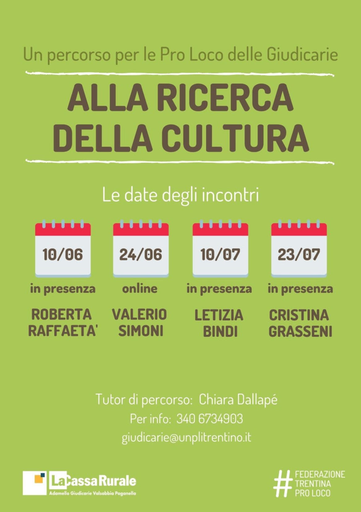 Si tratta di un percorso tenuto da quattro docenti di antropologia, organizzato dalla Federazione Pro Loco e sostenuto dalla Cassa Rurale Adamello Giudicarie Valsabbia Paganella, offerto a titolo gratuito alle Pro Loco e alle associazioni di volontariato che insistono nell'area delle Giudicarie. L'obiettivo del corso è accendere la curiosità sull’idea di CULTURA intesa come volano per le iniziative del volontariato sul territorio e come fattore che determina la qualità della vita delle comunità.