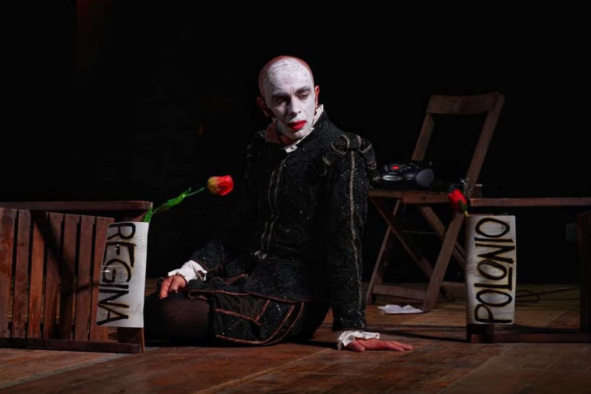 Michele Sinisi che interpreta l’Amleto: un solo attore e delle sedie, una sola voce per tutti i principali personaggi di questo testo, che è il dramma per antonomasia.