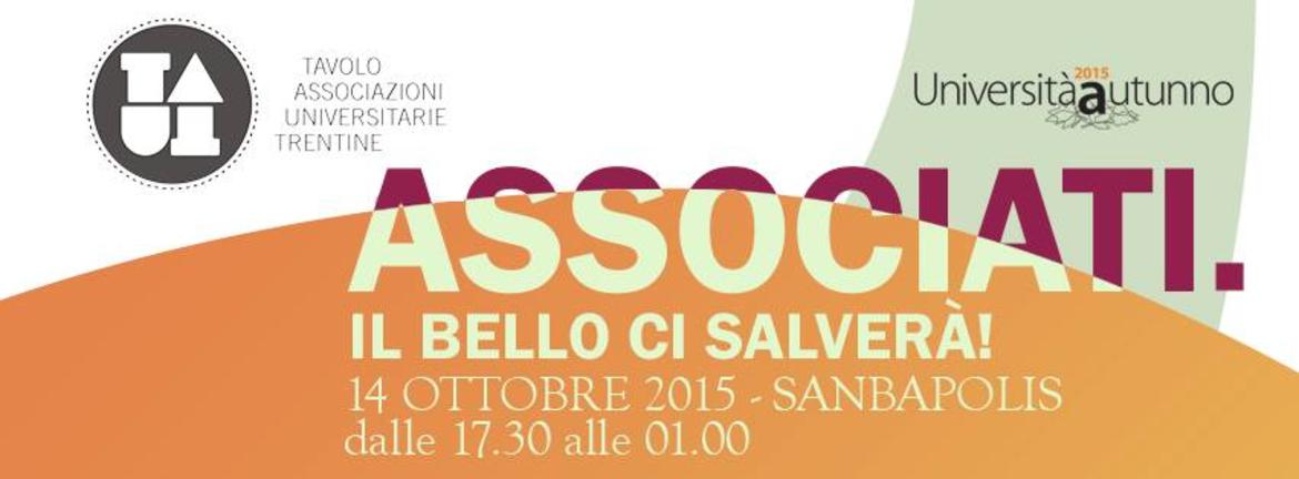 Tradizionale appuntamento Associati. Il bello ci salverà! organizzato dal Tavolo delle Associazioni Universitarie Trentine (TAUT) a dare il via - con musica, workshop, dibattiti, arte e creatività - all’edizione 2015 di Università Autunno, il calendario di eventi organizzato dall’Opera Universitaria per gli studenti e la città, in collaborazione con le associazioni studentesche, l’Università degli studi di Trento, la Circoscrizione Oltrefersina e altre associazioni del territorio.