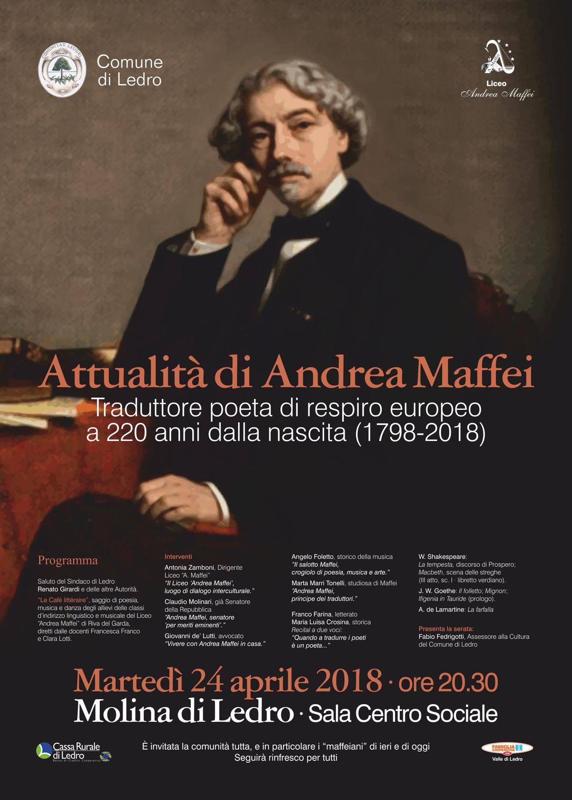 In occasione della ricorrenza dei 220 anni dalla nascita di Andrea Maffei, l’Amministrazione comunale in collaborazione con il professor Franco Farina e il Liceo Maffei di Riva del Garda, organizza un evento volto ad omaggiare il traduttore e poeta ledrense.