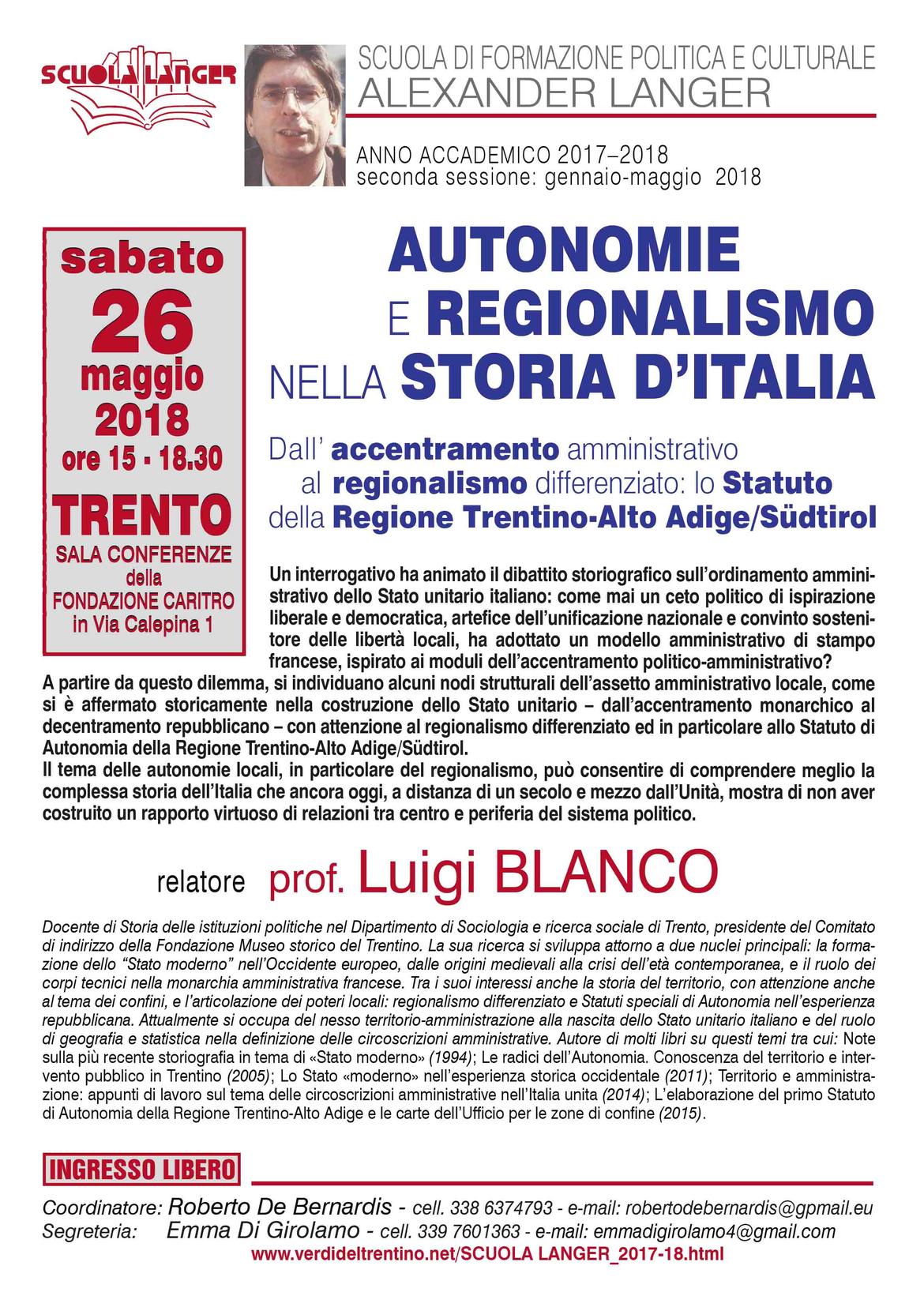 Relatore dell'incontro sarà il Prof. Luigi Blanco che interverrà con particolare riferimento allo Statuto di Autonomia della Regione Trentino-Alto Adige/Südtirol