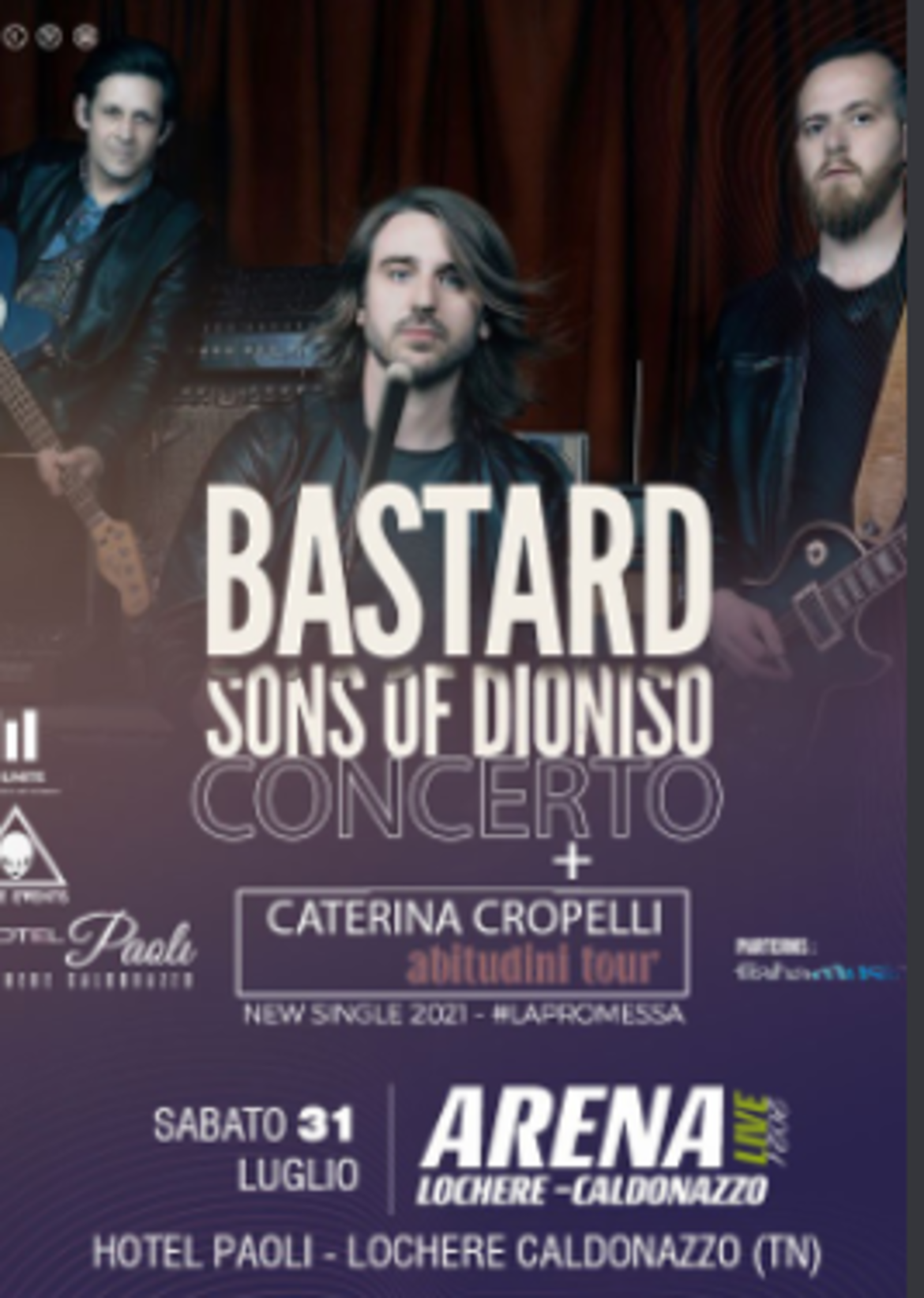 Si comincia con la Rock Band Trentina The Bastard Sons Of Dioniso + Caterina Cropelli , per un concerto pieno di emozioni come loro ci sanno dare. The Bastard Sons of Dioniso (noti anche con la sigla TBSOD) sono un gruppo musicale rock italiano, i cui componenti sono tutti originari della Valsugana, in Trentino.
