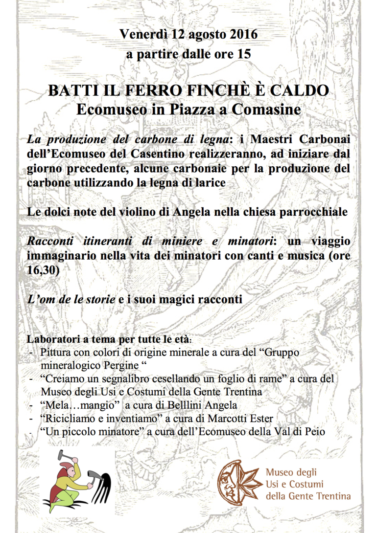 L’Ecomuseo della Val di Peio in ricordo di questa importante realtà del passato porta a Comasine, culla dell’antica attività mineraria l’iniziativa“BATTI IL FERRO FINCHÈ È CALDO”, festa che anima le vie del piccolo borgoe che ha come filo conduttore proprio le antiche miniere di Ferro.