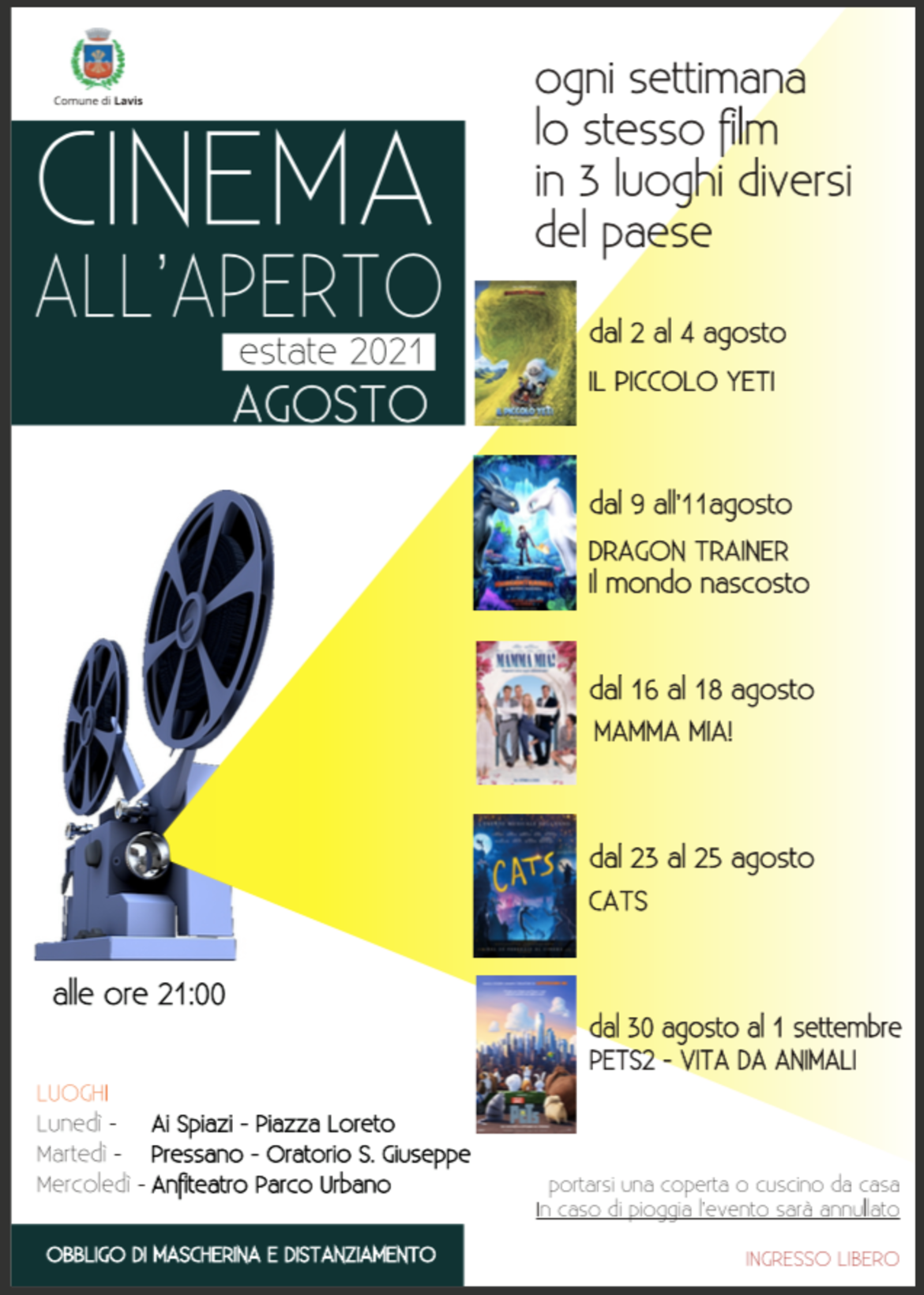 Ogni settimana lo stesso film sarà proiettato in tre luoghi diversi (Piazza Loreto, Oratorio di Pressano, Parco Urbano)