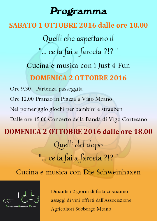 Prima e dopo la passeggiata si potrà fare festa in piazza a Meano con cucina e la musica di "Just 4 Fun" (sabato 1 ottobre) e Die Schweinhaxen (domenica 2 ottobre)