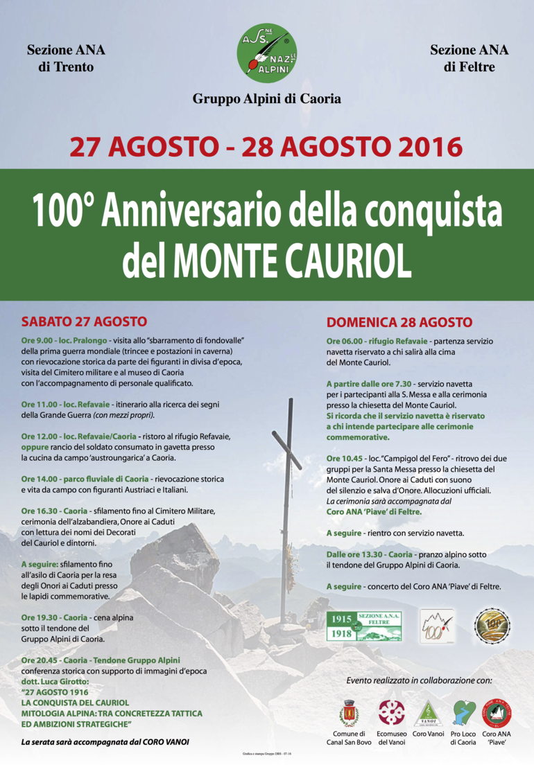 20.45 Conferenza storica con immagini d’epoca a cura del dr Luca Girotto: “27 AGOSTO 1916 - LA CONQUISTA DEL CAURIOL”. Mitologia alpina tra concretezza tattica ed ambizioni strategiche.