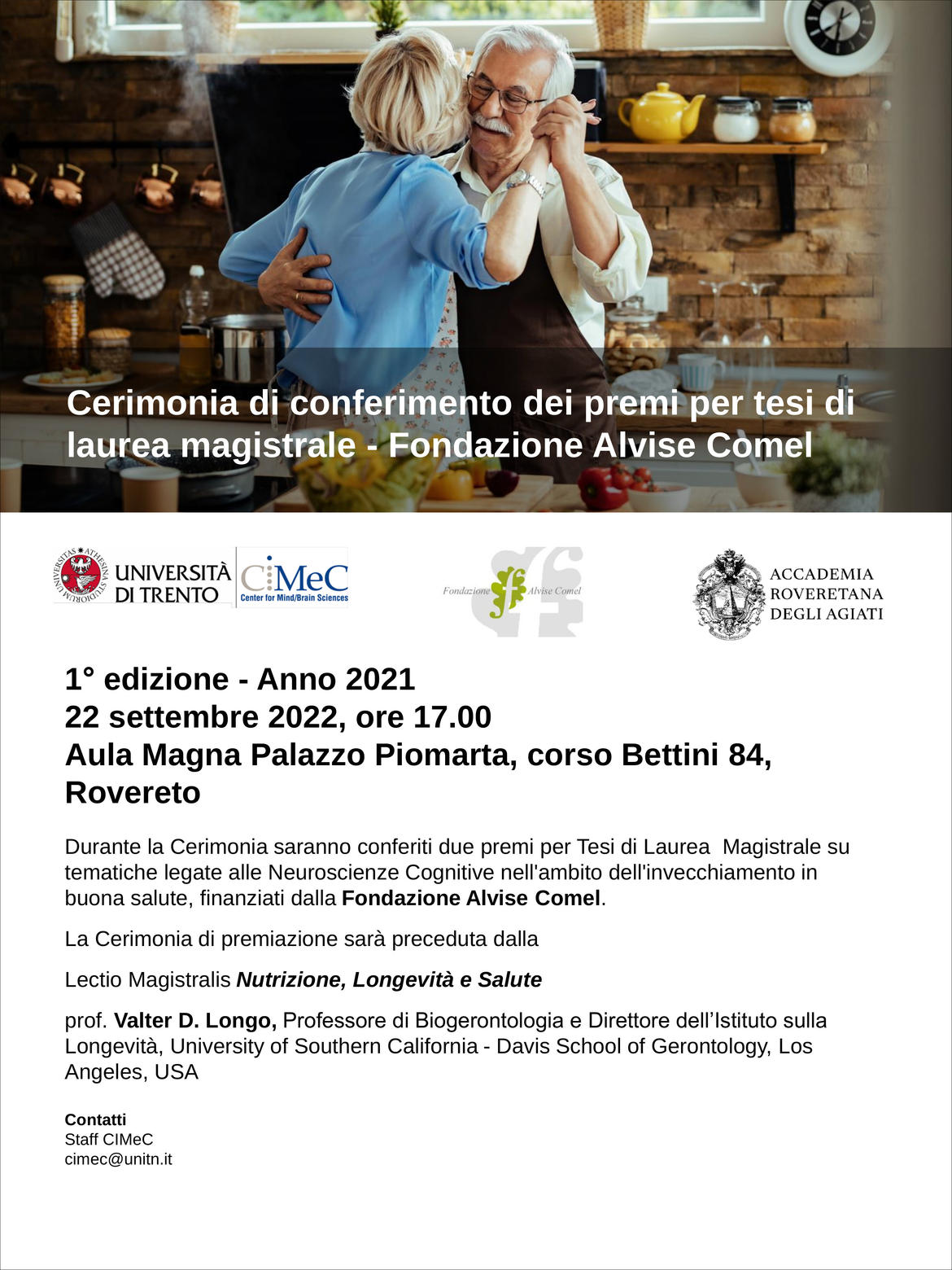 Durante la Cerimonia saranno conferiti due premi per Tesi di Laurea Magistrale su tematiche legate alle Neuroscienze Cognitive nell'ambito dell'invecchiamento in buona salute, finanziati dalla Fondazione Alvise Comel.