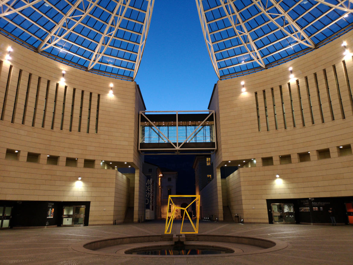 La scultura "Gold Shell" accoglie nella piazza del museo i visitatori: una grande struttura di metallo lucente, che disegna nell’aria la forma simbolo tipica del lavoro di Dynys e dà consistenza all’idea dell’andare oltre e del passaggio, un tema cruciale nella sua poetica.