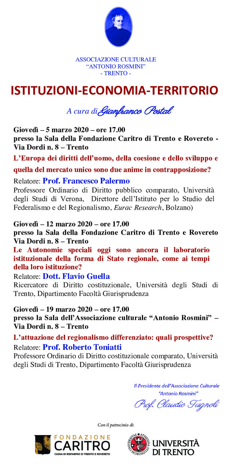 Primo appuntamento del ciclo "Istituzioni-Economia-Territorio" organizzato dall'Associazione culturale "Antonio Rosmini" in collaborazione con dell'Università di Trento.