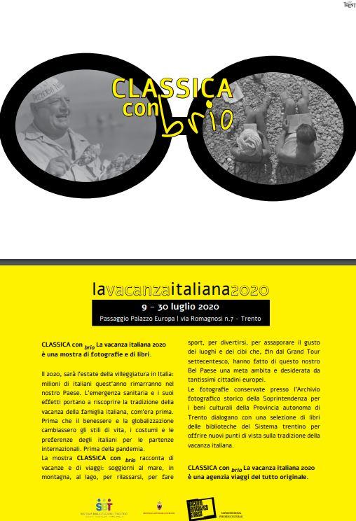 La mostra CLASSICA con brio racconta di vacanze e di viaggi: soggiorni al mare, in montagna, al lago, per rilassarsi, per fare sport, per divertirsi, per assaporare il gusto dei luoghi e dei cibi che, fin dal Grand Tour settecentesco, hanno fatto di questo nostro Bel Paese una meta ambita e desiderata.