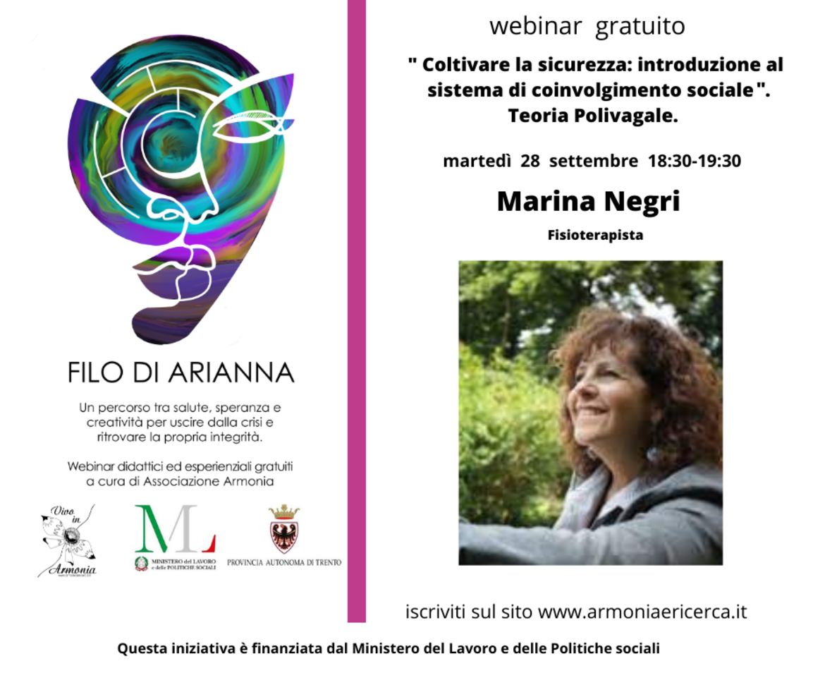 Per il terzo appuntamento di Filo di Arianna, calendario di appuntamenti organizzato da Associazione Armonia di Rovereto, è ospite dell’incontro di approfondimento Marina Negri fisioterapista. Durante l’incontro che si tiene il 28 settembre, in forma di webinar con diretta Zoom, e a partecipazione libera e gratuita ma su prenotazione al sito www.armoniaericerca.it (apre il link in una nuova finestra) , si approfondisce il tema “Coltivare la sicurezza: introduzione al sistema di coinvolgimento sociale”.