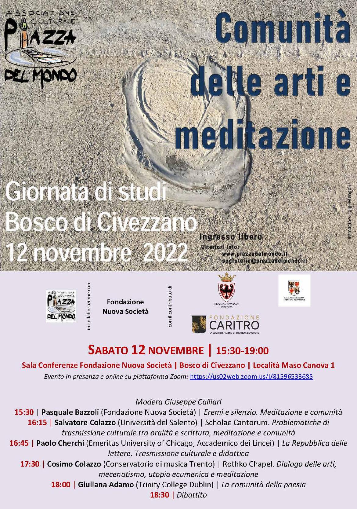 “Comunità delle arti e meditazione” è il titolo di una manifestazione che si tiene sabato 12 novembre, dalle 15:30 sino alle 19:30, a Bosco di Civezzano, presso la Fondazione Nuova Società (Località Maso Canova 1). Si tratta di una giornata di studi, organizzata dall’Associazione Culturale “Piazza del Mondo” in collaborazione con “Fondazione Nuova Società”, una comunità di solidarietà e meditazione religiosa che ha raggiunto i cinquant’anni di età. La giornata di studi vede la partecipazione di Pasquale Bazzoli (Fondazione Nuova Società), Salvatore Colazzo (Università del Salento), Paolo Cherchi (University of Chicago, Accademico dei Lincei), Cosimo Colazzo (Conservatorio di Trento), Giuliana Adamo (Trinity College Dublin). Modera Giuseppe Calliari.