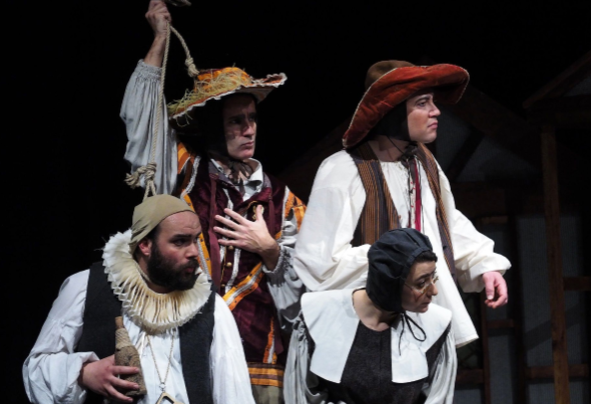 La commedia originale dal titolo Le legataire universel, scritta da Jean Francois Regnard nel 1708, è recitata ancora ai tempi nostri nei migliori teatri di Francia. Il testo “con en pè en la busa” non è tuttavia una traduzione della commedia di Regnard, ma soltanto una riduzione e un adattamento ad opera di Bruno Groff, in chiave moderna, in dialetto trentino pur cercando di mantenere inalterato lo spirito dell’autore