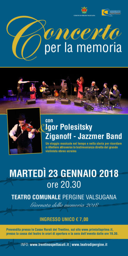 “Concerto per la memoria” con il violinista Igor Polesitsky e la jazzmer band Ziganoff: un viaggio musicale nel tempo e nella storia per ricordare e riflettere attraverso la storia del grande violista ebreo- ucraino.
