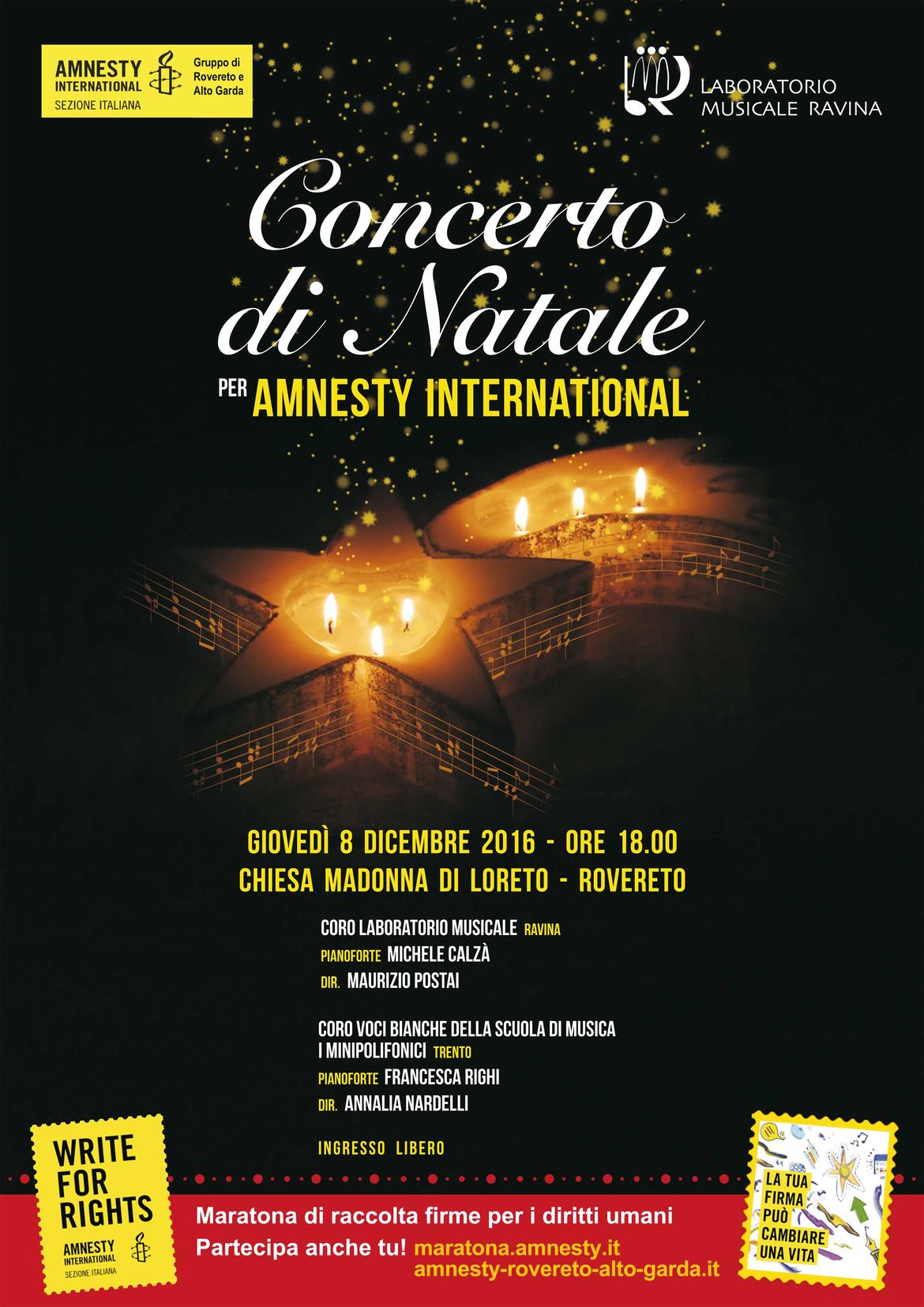 Appuntamento coi cori Laboratorio Musicale di Ravina, diretto dal maestro Maurizio Postai, e Voci Bianche della Scuola i Minipolifonici di Trento, diretto dalla maestra Annalia Nardelli, che proporrano brani corali natalizi (e non solo). Durante la serata gli attivisti di Amnesty International del gruppo di Rovereto e Alto Garda inviteranno il pubblico a partecipare a “Write for Rights”, la maratona mondiale di raccolte firme in difesa di donne e uomini che stanno subendo pesanti violazioni dei diritti umani.