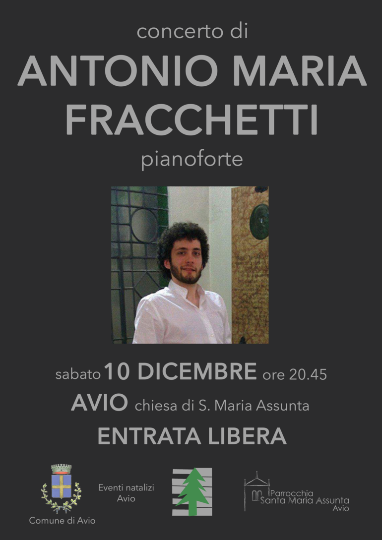 Antonio Maria Fracchetti nasce a Trento nel 1991. Nel 2016, sotto la guida di Antonella Costa, ha completato il biennio solistico-concertistico di pianoforte presso il Conservatorio “F.A. Bonporti” di Trento con il massimo dei voti e la lode. Ha frequentato grazie al progetto Erasmus l’anno accademico 2012/2013 al Mozarteum di Salisburgo sotto la guida di Imre Rohmann.