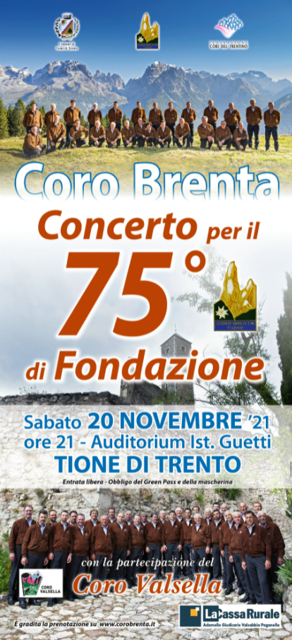 Invitiamo tutti a partecipare alla serata dedicata al nostro 75° anno di fondazione che festeggeremo con un concerto insieme agli amici del Coro Valsella di Borgo Valsugana.