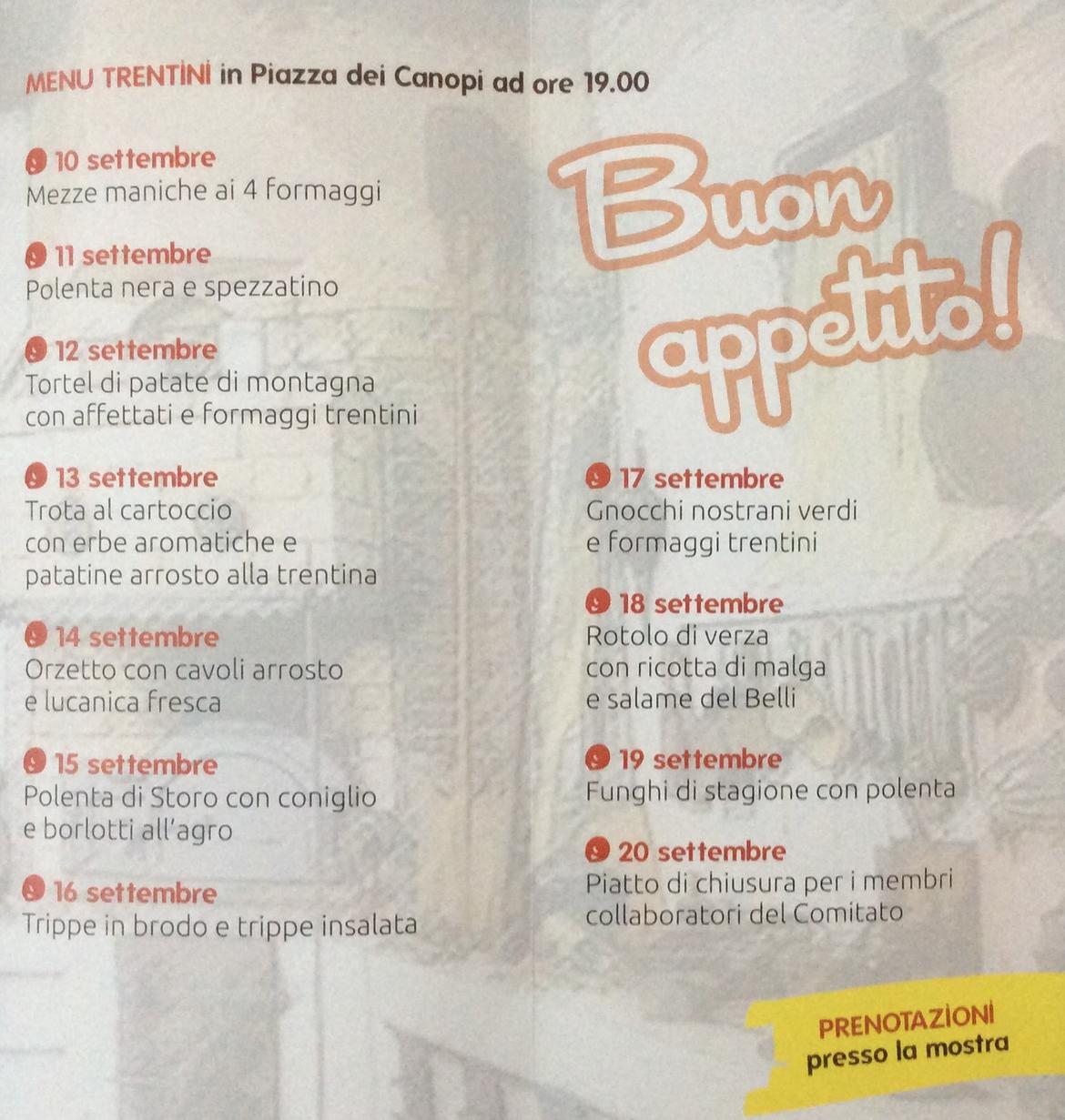 Ogni giorno verranno preparati dei piatti tipici trentini in piazza dei Canopi.