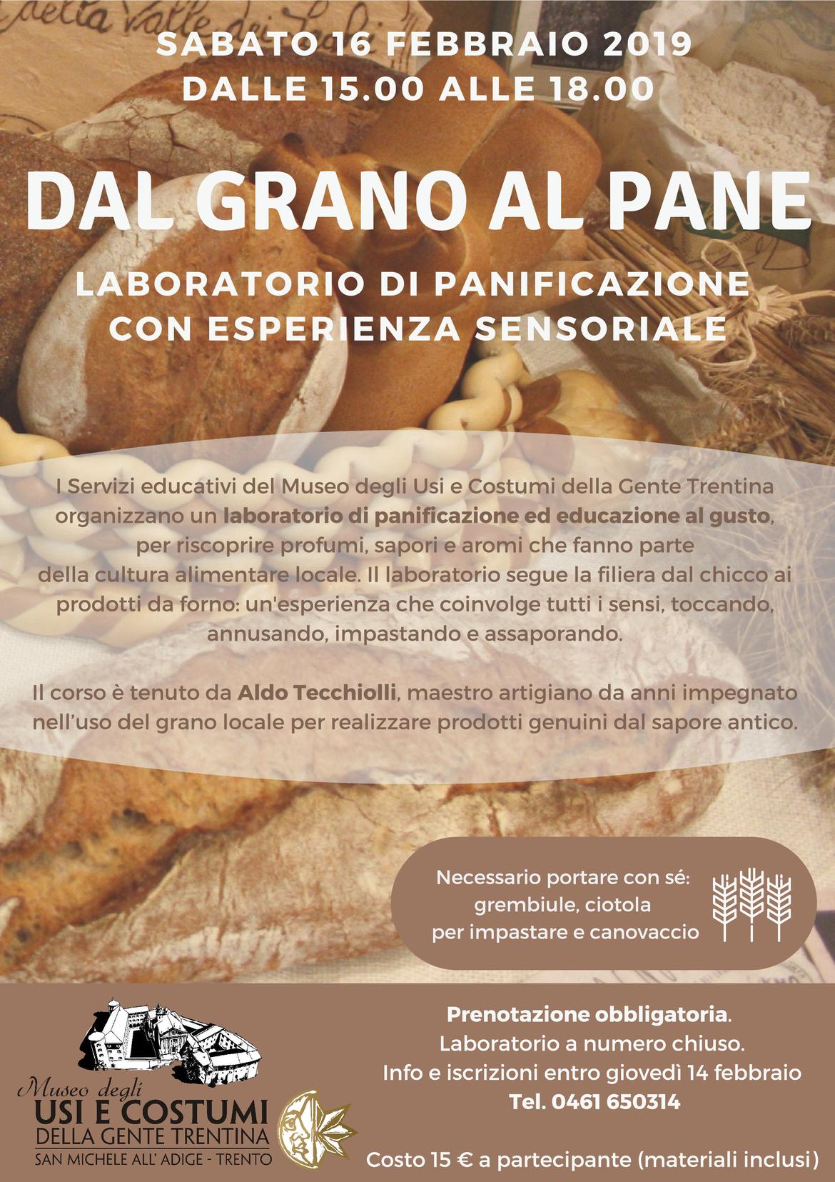 I Servizi educativi del Museo degli Usi e Costumi della Gente Trentina organizzano per sabato 16 febbraio, dalle 15.00 alle 18.00, "Dal grano al pane", laboratorio di panificazione ed educazione al gusto, per riscoprire profumi, sapori e aromi che fanno parte della cultura alimentare locale. Il laboratorio segue la filiera dal chicco ai prodotti da forno: un'esperienza che coinvolge tutti i sensi, toccando, annusando, impastando e assaporando. Il corso è tenuto da Aldo Tecchiolli, maestro artigiano da anni impegnato nell’uso del grano locale per realizzare prodotti genuini dal sapore antico.