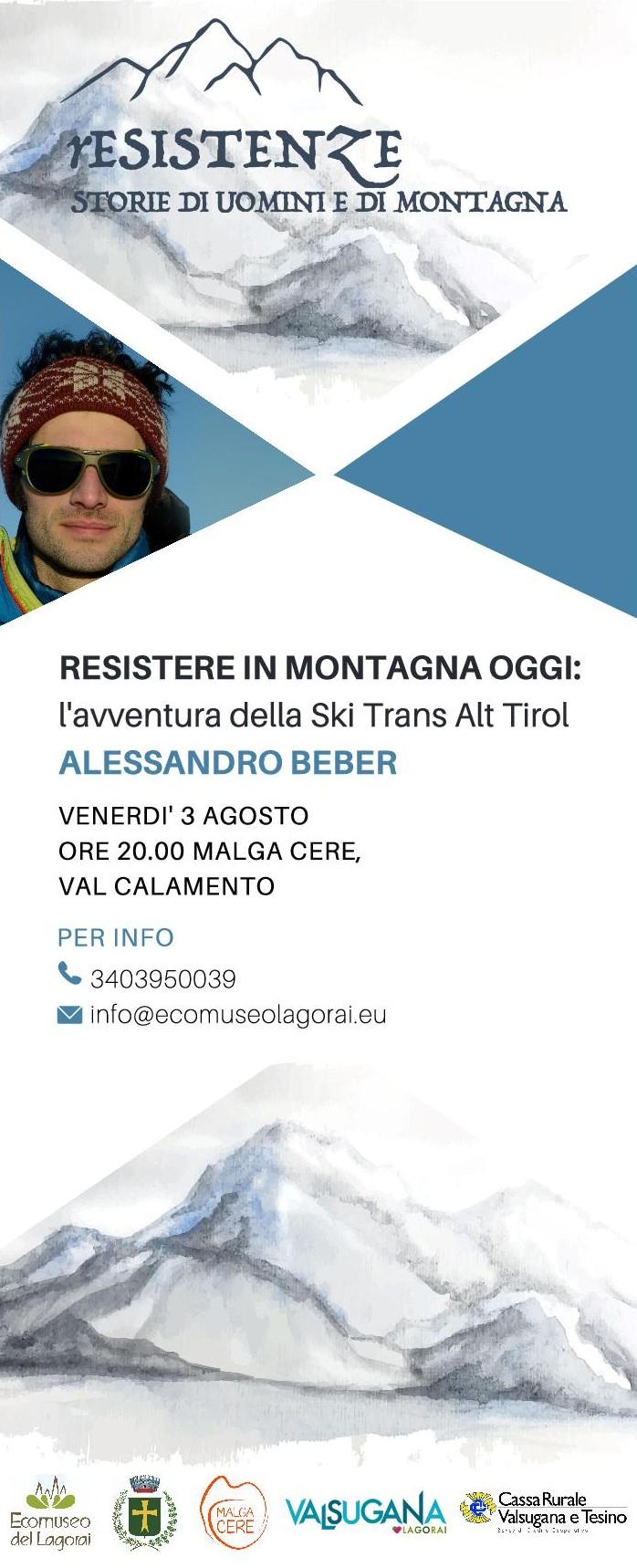 Alessandro Beber, classe 1986 è un geografo di formazione e alpinista per passione che svolge a tempo pieno la professione di Guida Alpina. Cresciuto alle pendici del Lagorai, nel 2010 ha pubblicato una guida scialpinistica su quelle che considera le montagne di casa ed ha aperto diversi nuovi itinerari d'arrampicata nella zona più orientale del massiccio. Racconta che sin da bambino provava un turbine di emozioni ad un qualsiasi riferimento all'alpinismo e all'arrampicata, diventare Guida Alpina è stata quindi una scelta naturale, sostenuta dalla volontà di continuare a sognare ad occhi aperti e condividere le soddisfazioni di quell'impareggiabile scuola di vita che è la montagna. La volontà di documentare le proprie esperienze con lo scopo di “trasmettere almeno un briciolo della struggente bellezza che gli alpinisti trovano tra le montagne” è alla base della Ski Alp Trans Tirol ovvero traversata in invernale del Tirolo storico completata nell’aprile 2018.