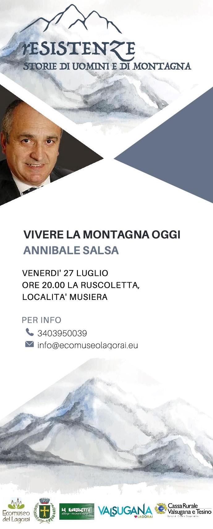 Annibale Salsa, è un antropologo. Presidente del Club Alpino Italiano dal 2004 al 2010, oggi è presidente del Comitato Scientifico di Accademia della Montagna del Trentino e Presidente del Comitato scientifico del Museo Usi e Costumi della Gente Trentina di San Michele, Membro Comitato scientifico della Fondazione Dolomiti-Unesco. Ha insegnato Antropologia filosofica e Antropologia culturale presso l’Università di Genova fino all’anno accademico 2007. Ha condotto studi e ricerche su tematiche relative alla genesi ed alla trasformazione delle identità delle popolazioni delle Alpi. Si occupa di temi e problemi attinenti l’Antropologia del turismo montano con particolare riferimento alle Alpi in generale. E’ autore di articoli e di saggi su Riviste scientifiche specialistiche e di divulgazione, anche in contesti internazionali.Collabora, in qualità di editorialista, con il quotidiano “l’Adige” di Trento.