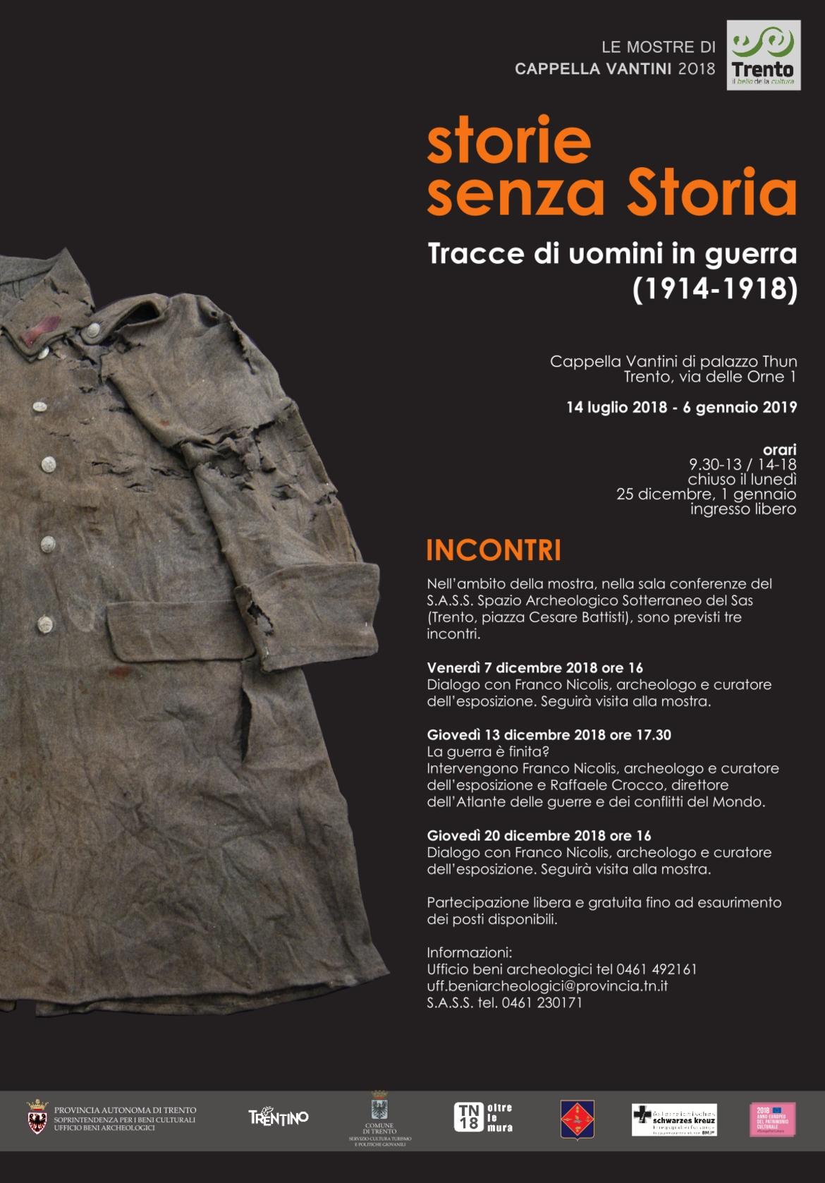 Nell'ambito della mostra “storie senza Storia. Tracce di uomini in guerra (1914-1918)” incontro con Franco Nicolis archeologo e curatore dell'esposizione. A seguire visita alla mostra.