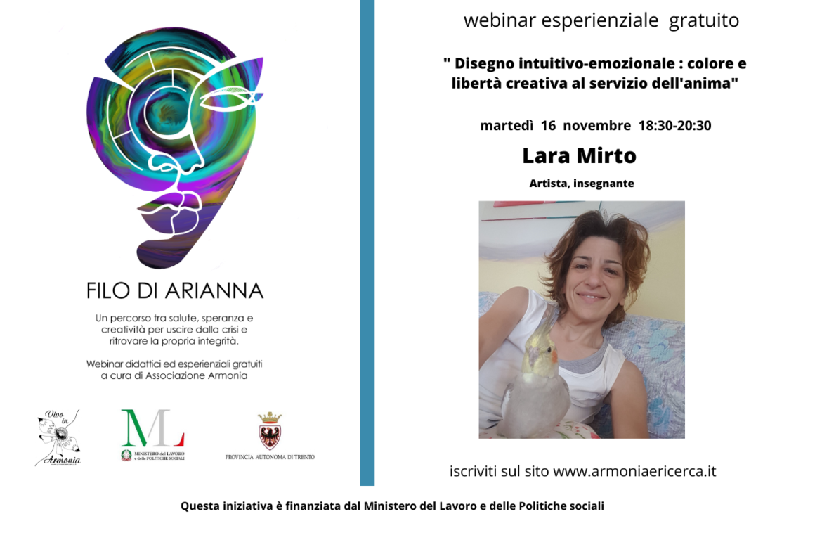 Si conclude quindi la parte laboratoriale di Filo di Arianna, il calendario di incontri in forma online organizzati da Associazione Armonia che hanno accompagnato per tutto il 2021 il pubblico alla scoperta dei tanti linguaggi e segreti con cui entrare in modo più profondo in contatto con se stessi, in rapporto con l’ambiente e gli altri, per un ritrovato benessere psicofisico. Il 16 novembre alle ore 18,30 l’appuntamento è su piattaforma zoom, a titolo gratuito ma con prenotazione al sito www.armoniaericerca.it e magari la richiesta di sottoscrivere tessera associativa così da rimanere aggiornati sulle attività e sostenere le iniziative dell’associazione di Rovereto.