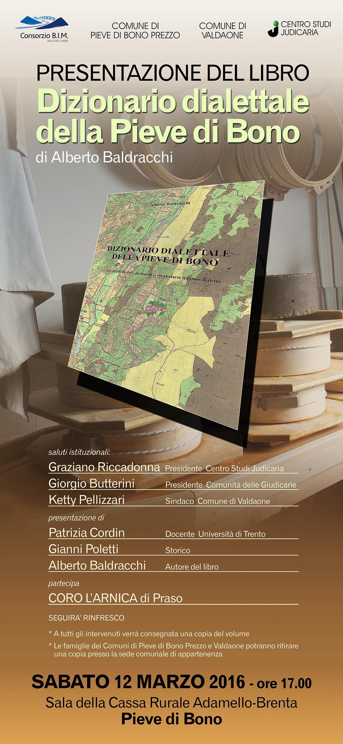 Il Dizionario dialettale di Alberto Baldracchi, fresco di stampa ed edito dal Centro Studi Judicaria, è stato redatto, secondo quanto riferito dall’autore, “con lo scopo di voler ricordare il modo di parlare nelle case, nei campi e sui monti fino a cinquant’anni or sono: il dialetto dei paesi della Pieve di Bono, una lingua che affonda le sue radici nella millenaria cultura contadina della nostra gente”.