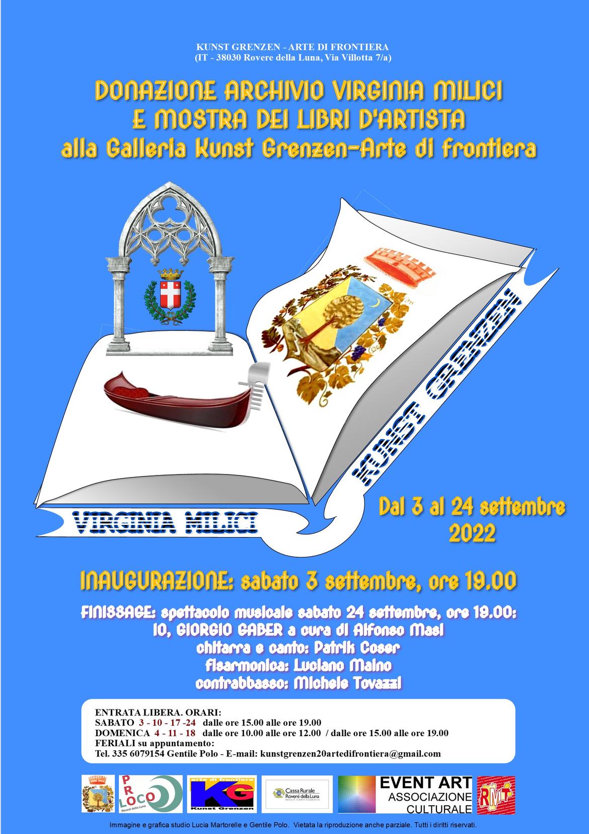 L'evento "DONAZIONE VIRGINIA MILICI E MOSTRA DEI LIBRI D'ARTISTA" è realizzato dall'Associazione culturale Kunst Grenzen-Arte di frontiera aps in collaborazione con l'artista Virginia Milici, Comune e Pro Loco di Rovere' della Luna, Cassa Rurale Rotaliana e Giovo, Event Art e Radio Music Trento.