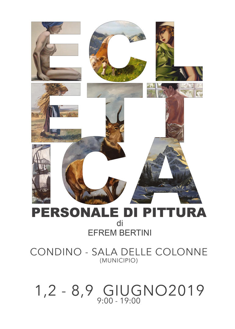 In questa mostra dal titolo “ECLETTICA”, si vuole porre appunto l’attenzione sulla personalità trasformista dell’artista, messa in evidenza dalla scelta di una moltitudine di soggetti diversi, e sul percorso e la crescita dell’autore che, sperimentando tecniche, stili, colori, attraversando il cubismo, l’impressionismo, il materico, ha poi raggiunto la sua identità e maturità artistica nella tecnica pittorica figurativa. Così questo percorso espositivo accompagnerà il visitatore in un viaggio da definire necessariamente “eclettico”, cioè privo di un determinato sistema o indirizzo, ma ricco di sistemi e indirizzi mescolati tra loro, personalizzati, estrapolati e armonizzati in qualcosa di assolutamente unico. Per questo motivo, siamo certi, che almeno un’opera tra quelle proposte colpirà il cuore dell’osservatore come una freccia di Cupido, perché all’interno di un’esplosione di colori, stili e soggetti diversificati, ognuno troverà un po’ di sé, il proprio personale e segreto “colore dell’anima”. (Elisabetta Ferrera)