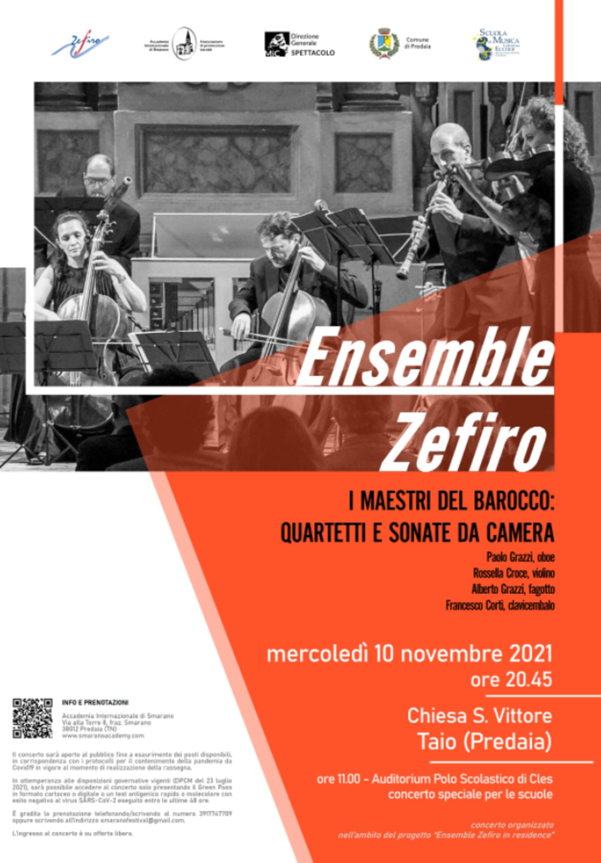 Il concerto “I Maestri del Barocco: quartetti e sonate da camera” vedrà protagonista l'Ensemble Zefiro formato da Alfredo Bernardini (oboe), Rossella Croce (violino), Alberto Grazzi (fagotto), Francesco Corti (clavicembalo).