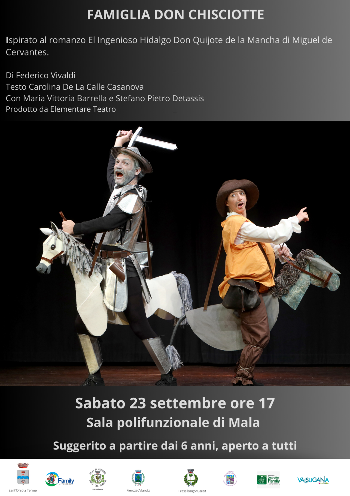 Sabato 23 settembre alle ore 17 presso la Sala polifunzionale di Mala andrà in scena lo spettacolo "FAMIGLIA DON CHISCIOTTE", ispirato al romanzo El Ingenioso Hidalgo Don Quijote de la Mancha di Miguel de Cervantes.