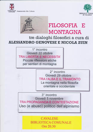 I relatori, già apprezzati in precedenti cicli di incontri filosofici organizzati dalla biblioteca, dialogheranno con gli intervenuti sul tema “Filosofia e montagna”.