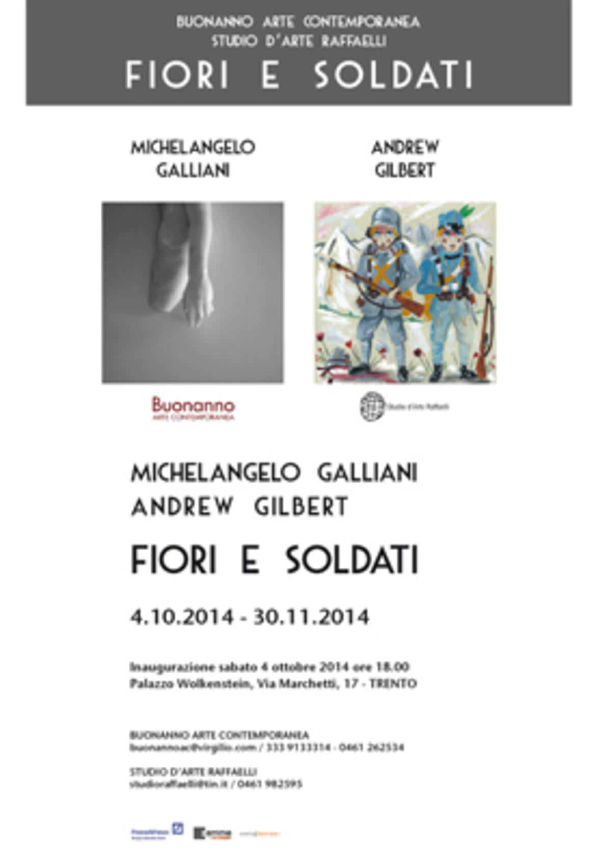 Dopo il grande successo della mostra estiva Forte Comune 1914/2014 tenutasi a Forte Strino, Vermiglio (TN), la doppia personale di Michelangelo Galliani e Andrew Gilbert Fiori e soldati approda nelle suggestive sale di Palazzo Wolkenstein a Trento.