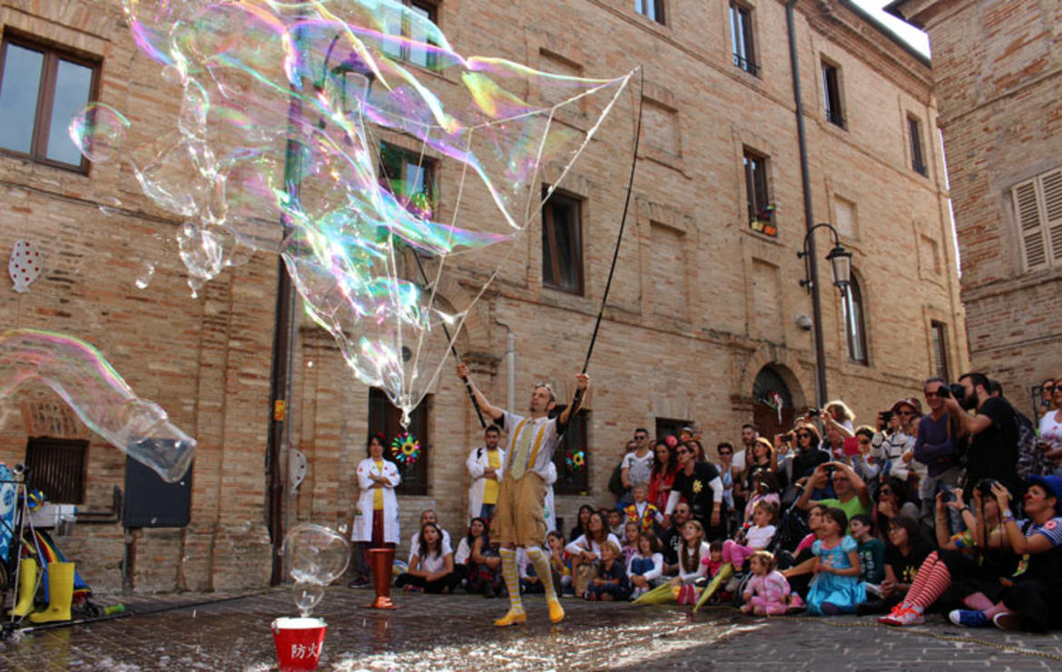 Una sarabanda di giochi, zampilli d’acqua e fragilissime sfere di tutte le dimensioni: teatro di strada che arriva sul palco di un teatro vero e proprio, per raccontare una vicenda sognante ed emozionante, tra momenti comici e strabilianti effetti, nella più effimera delle arti circensi.
