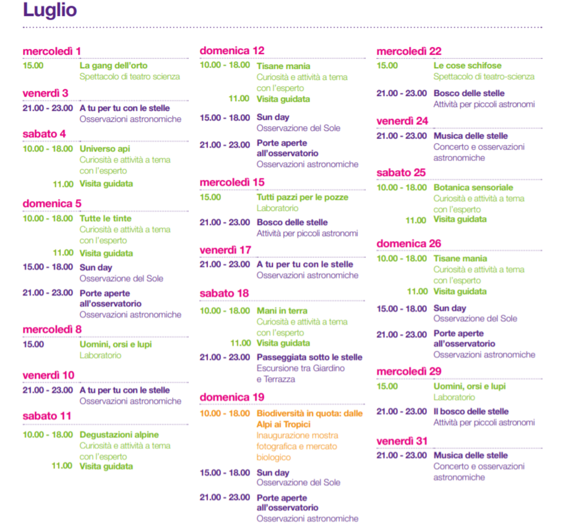 Gli appuntamenti segnati in verde si svolgeranno presso il Giardino Botanico Alpino, quelli in viola presso la Terrazza delle Stelle, mentre quelli in arancione sono eventi speciali