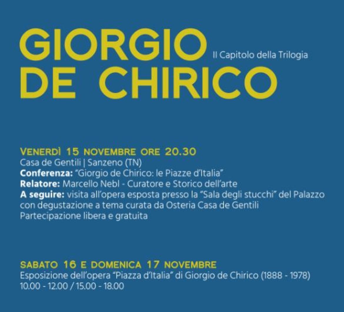 Nebi illustrerà un’opera fondamentale del pittore metafisico Giorgio de Chirico inaugurando l’esposizione dell’opera prevista anche nei due giorni successivi sabato 16 e domenica 17 novembre.