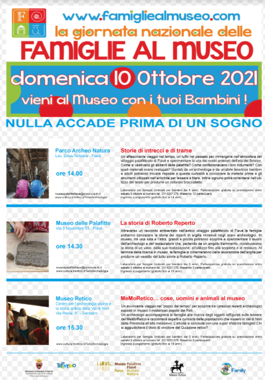 Domenica 10 ottobre si rinnova l'appuntamento con F@Mu la Giornata nazionale delle famiglie al museo. All'iniziativa aderiscono anche il Museo Retico di Sanzeno, il Museo delle Palafitte e il Parco Archeo Natura di Fiavé con proposte coinvolgenti - laboratori, racconti e visite interattive – per condividere la bellezza del nostro patrimonio culturale all'insegna del gioco e del divertimento. La partecipazione alle attività è gratuita previa prenotazione al numero 331 6201376 entro sabato 9 ottobre (ingresso ai musei e al parco a pagamento, gratuito fino ai 14 anni).