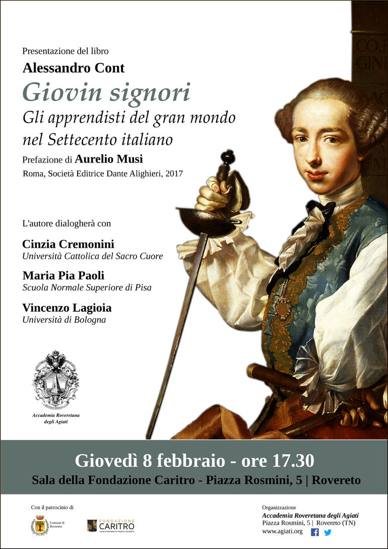 "Le personalità e le biografie dei giovani gentiluomini rispecchiano e incidono, nel contempo, sulla varietà e sulle dinamiche del mondo nobiliare italiano nel secolo XVIII. Secondo un luogo comune dell’epoca, sviluppato magistralmente nel poemetto Il giorno di Giuseppe Parini, i rampolli dei casati aristocratici sono spesso damerini infingardi, narcisisti ed effeminati. Numerose fonti archivistiche inedite di diversa provenienza consentono di precisare le ragioni e l’effettivo ruolo storico di questo fenomeno sociale. Ma soprattutto, esse contribuiscono a chiarire analogie e diversità nelle attitudini e nei costumi dei «giovin signori» della Penisola e delle maggiori isole adiacenti durante l’ultimo secolo dell’Antico Regime. Così, alla luce dei loro rapporti familiari, della loro formazione culturale, del loro progressivo inserimento nel «gran mondo» (alta società) i giovani nobili si mostrano nella concretezza del loro vissuto e nella realtà del loro ceto di appartenenza."